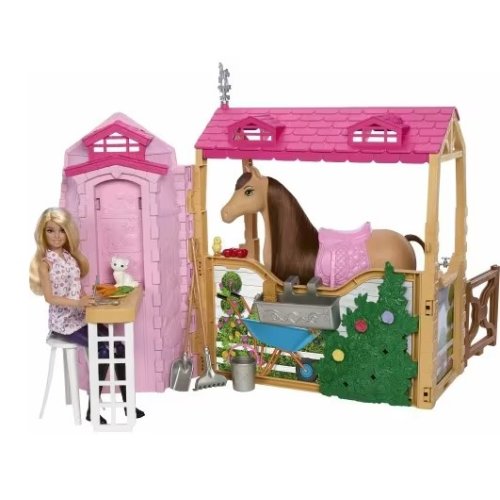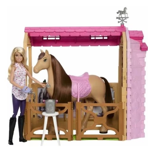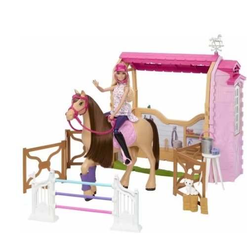 Entra nel mondo equestre con Barbie: una stalla completa che si richiude per essere riposta facilmente, dotata di più aree di gioco — alimentazione, toeletta, salto — e oltre 25 accessori per raccontare storie di cavalli e avventura. Ideale per bambine dai 3 anni in su.