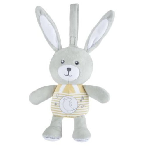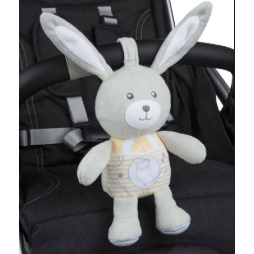 Morbido coniglietto giocattolo Chicco con luci soffuse e melodie rilassanti per accompagnare il tuo bambino nella nanna, con laccetto per fissaggio al lettino o passeggino e rivestimento lavabile.