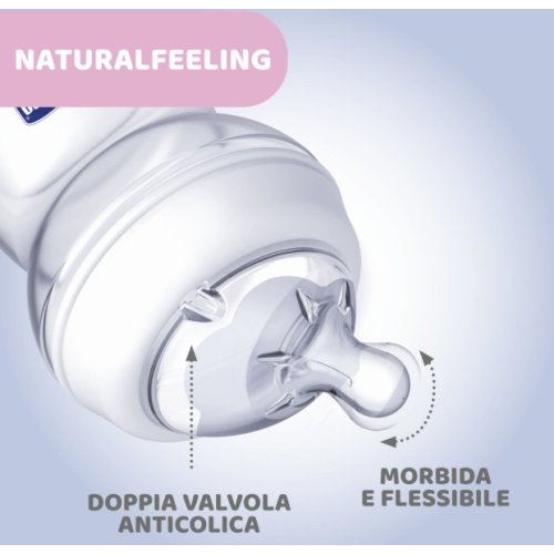 Il biberon in vetro della linea Chicco Natural Feeling, con capacità di 250 ml e indicato per neonati da 0+ mesi, è progettato per offrire un’esperienza di alimentazione il più simile possibile all’allattamento naturale.