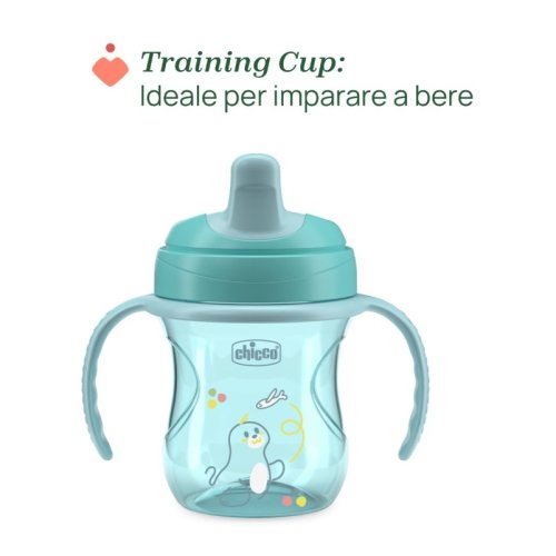 Tazza Training Cup – tazza antigoccia con manici ergonomici e removibili, pensata per favorire la presa indipendente e facilitare il passaggio dal biberon alla tazza.