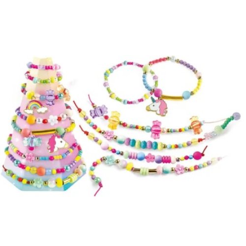 Con questo set è possibile realizzare braccialetti colorati e alla moda, decorati con perline e charm a tema unicorn.