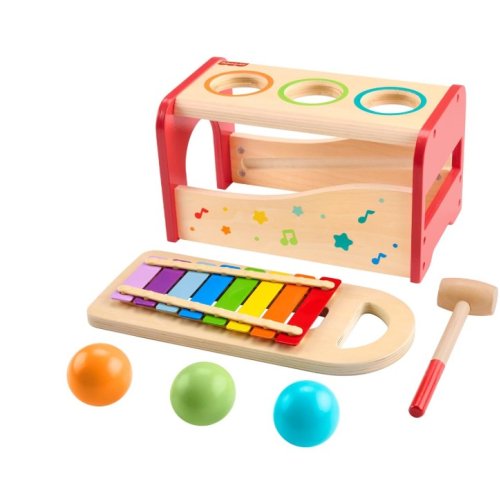 Realizzato in legno di alta qualità, combina due attività divertenti: il bambino può battere le palline con il martelletto e guardarle rotolare sullo xilofono, producendo allegre melodie, oppure può estrarre lo xilofono e suonarlo direttamente.