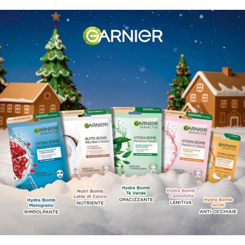 Maschere viso Hydra Bomb Garnier – formulazione super idratante per una pelle morbida, luminosa e rinfrescata.