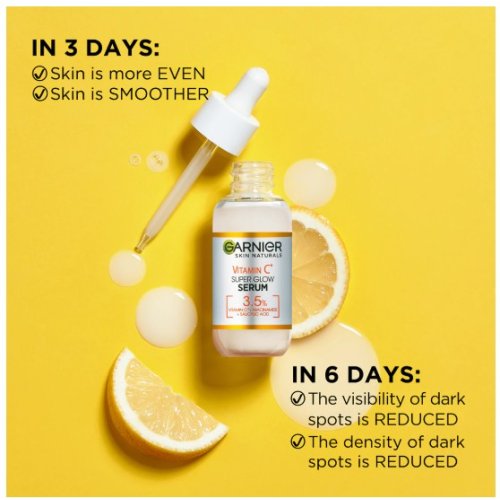 Il siero con vitamina C Garnier Skin Naturals Vitamin C Super Glow Serum ti aiuterà a ottenerla in appena 6 giorni. Ha intensi effetti illuminanti, in modo da liberare il tuo viso dall’aspetto spento e stanco.