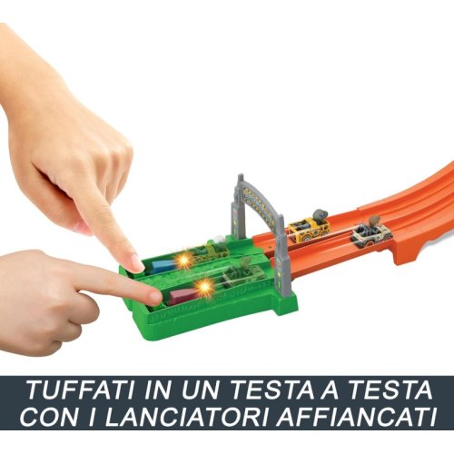 Il set include 2 macchinine Hot Wheels per sfide avvincenti e ore di divertimento, con una pista ricca di ostacoli, rampe e sorprese.