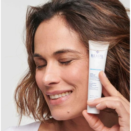La Crema Antirughe Rilastil Progression+ è un trattamento quotidiano studiato per contrastare i segni dell’invecchiamento e migliorare visibilmente la densità e l’elasticità della pelle.