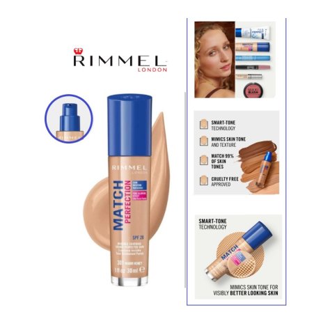 Grazie alla tecnologia moderna il fondotinta liquido Rimmel Match Perfection SPF 20 si adatta perfettamente alla pelle e lascia il tuo viso meravigliosamente uniforme, liscio e
